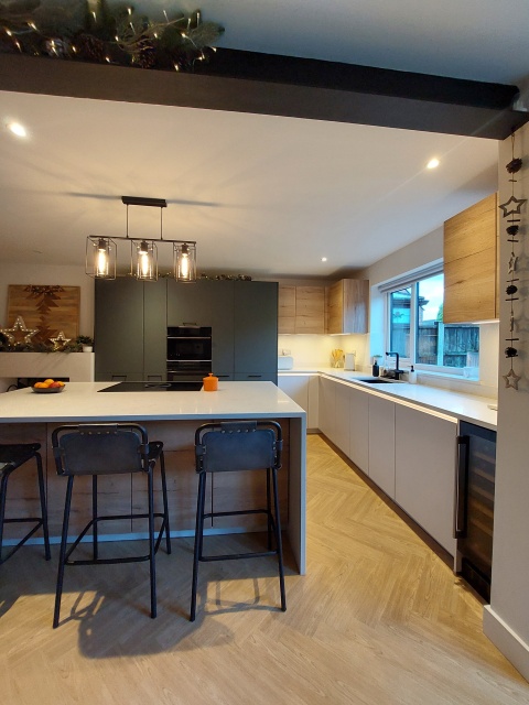 In this fantastic kitchen our lovely customer combined the mineral green doors from our Easytouch range for the tall units, the satin grey doors for the base units and the sierra oak doors for the wall units and under the island. The German wall unit and handle lighting, as well as the white quartz worktops with waterfall end panels on the island made this a real showstopper of a kitchen.